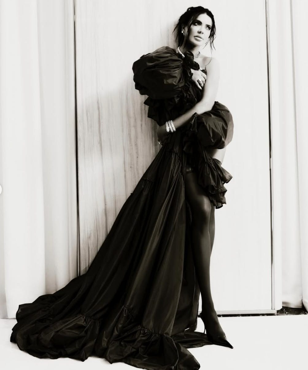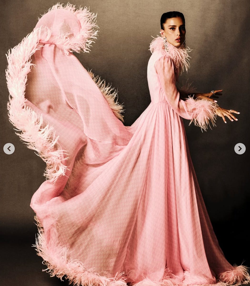 Look Dior. Ao escolher um look criado por Jonathan W. Anderson, ela dá mais uma amostra do seu olhar estético. JWA é um designer que não vende só roupa, vende um pensamento visual. Tanto que o look escolhido não é o bonito óbvio. Fora isso, claro que a Dior teve ter pago uma fortuna de anúncio. Nenhuma escolha é só uma escolha.