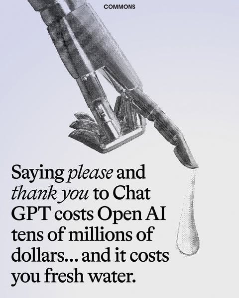 Algumas semanas atrás, eu li que cada pergunta feita a um chatbot custa milhões de dólares e gasta muita energia e milhões de litros de água. Porque os nossos amazing tech macho men bilionários não têm essa preocupação, óbvio, fato, já sabemos. Eu realmente não ligo se o Sam Altman tá gastando os milhões dele a cada prompt pro ChatGPT, mas eu ligo pro gasto de energia e água, que não é dele, é nosso.