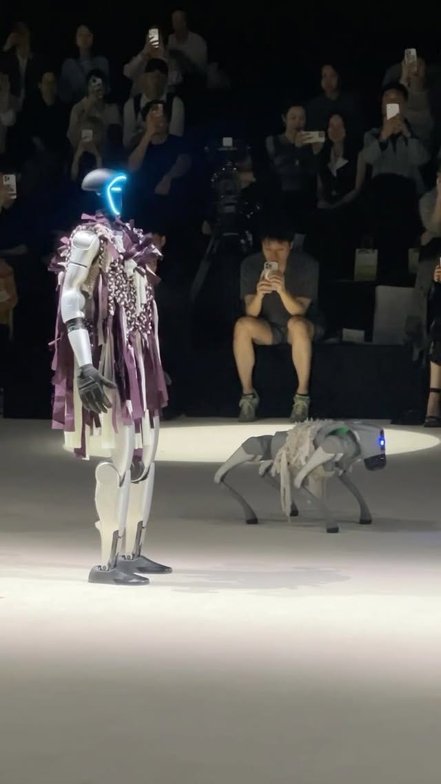 Os robôs tomaram conta da passarela da marca NMTG, na Shangai Fashion Week. Um robô humanoide G1 foi acompanhado de seu amigo robô quadrúpede, ambos estreando como modelos. 😂